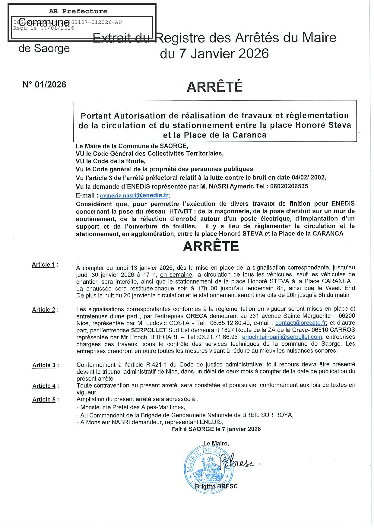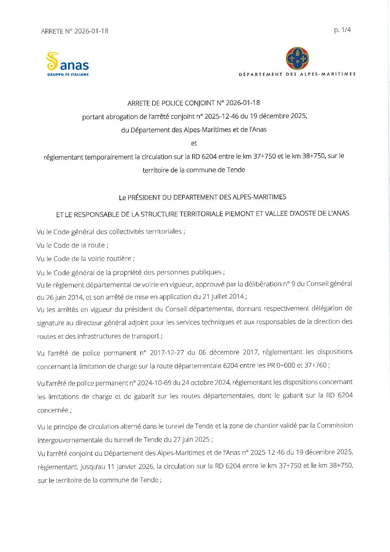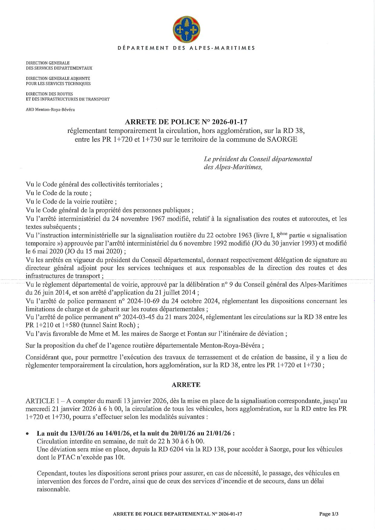 Nouvel arrêté départemental relatif à la fermeture de la RD 38 (tunnel St Roch) entre Fontan et Saorge 09/01/2026 Lire la suite