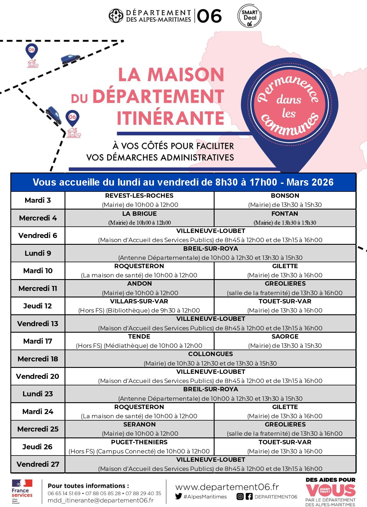 ACTUALITÉS Fermeture de l’accueil de la Mairie les après-midis du 2 au 6 mars 2026 27/02/2026 Lire la suite Annulation enlèvement des encombrants le lundi 2 mars 2026 27/02/2026 Lire la suite Fermeture des tunnels Sud et Nord de Saorge sur la RD 6204 la nuit du 12 au 13 mars 2026 de 22h à 5h 23/02/2026 Lire la suite Permanence de la Maison du Département Itinérante en mars 2026 20/02/2026 Lire la suite Permanence du Bureau de l’Habitat en mars 2026 13/02/2026 Lire la suite La Mairie de Saorge recrute ! 13/02/2026 Lire la suite 1 2 3 4 5 6 7 8 9 Suivant »