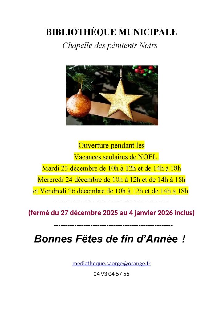 Dates d’ouverture de la bibliothèque pendant les vacances de Noëlpar adm-saorgesur Publié le 10/12/202510/12/2025