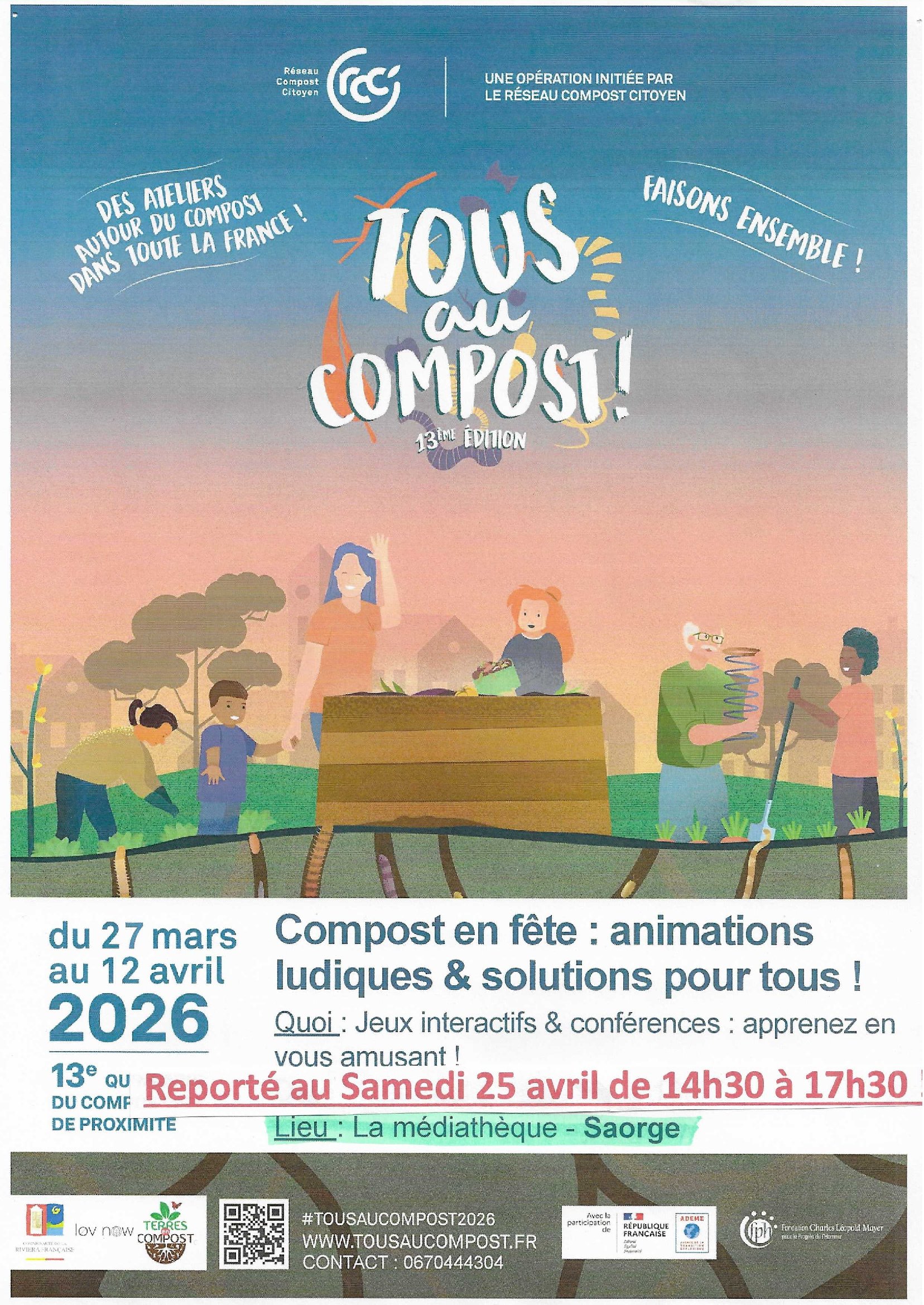 L’animation »Tous au Compost » estannulée demain mercredi 8 par l’intervenanteClaire Serrano et reportée au Samedi 25 avril de 14h30 à 17h30 en bibliothèque de Saorge.