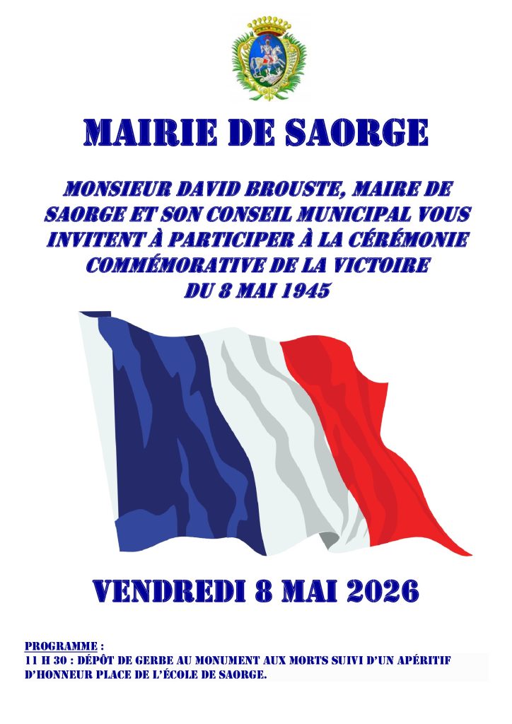 Cérémonie du 8 mai + Ajouter à mon Agenda Google + iCal / Outlook export 00 jours 00 heures 00 minutes 00 secondes Date 08 Mai 2026 Heure 11:30 Lieu Monument aux Morts Catégorie Cérémonie Tradition Organisateur Mairie de Saorge Téléphone 04 93 04 51 23 Email mairie@ville-saorge.fr Site Web http://www.saorge.fr Partagez cet événement
