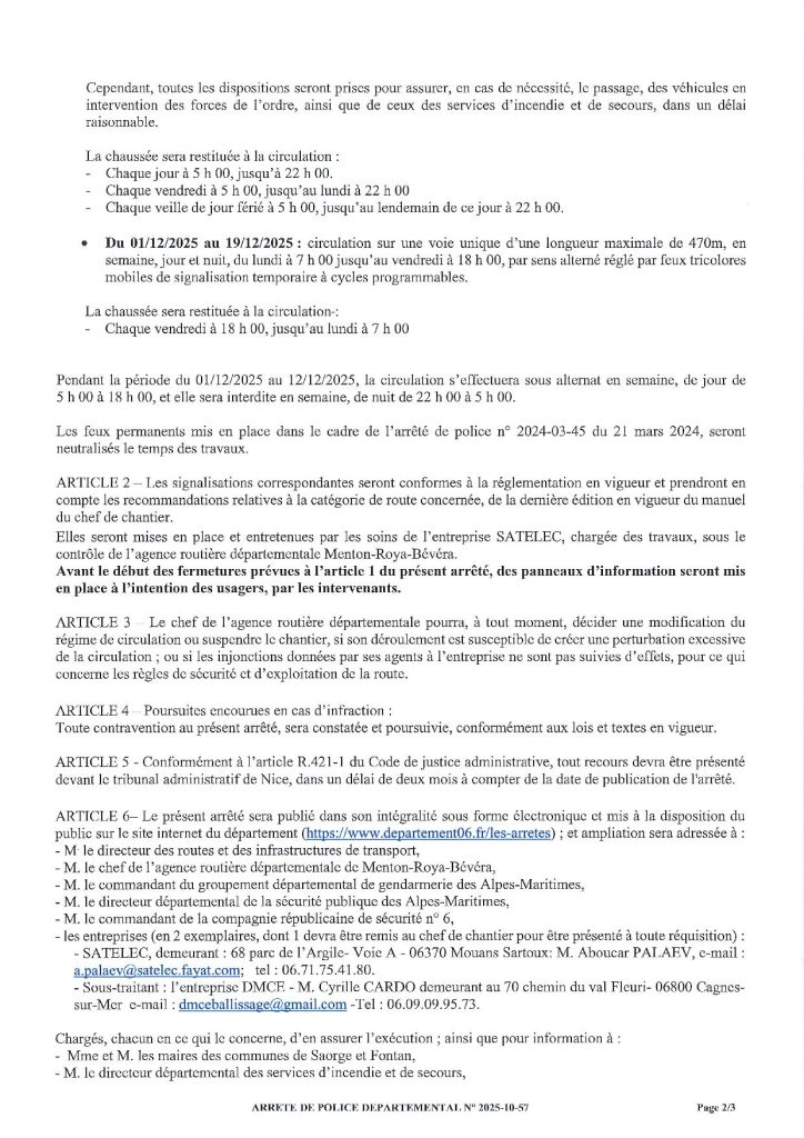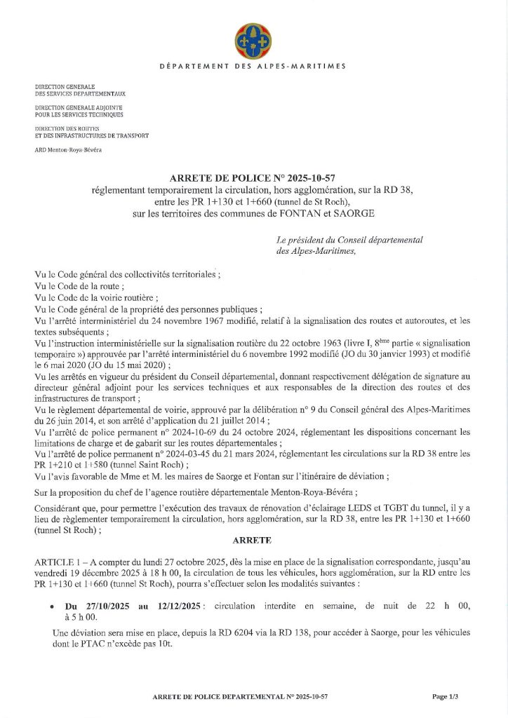 Fermeture de la RD 38 (tunnel St Roch) entre Fontan et Saorge en semaine de nuit à partir du 27 octobre 2025par adm-saorgesur Publié le 22/10/202522/10/2025