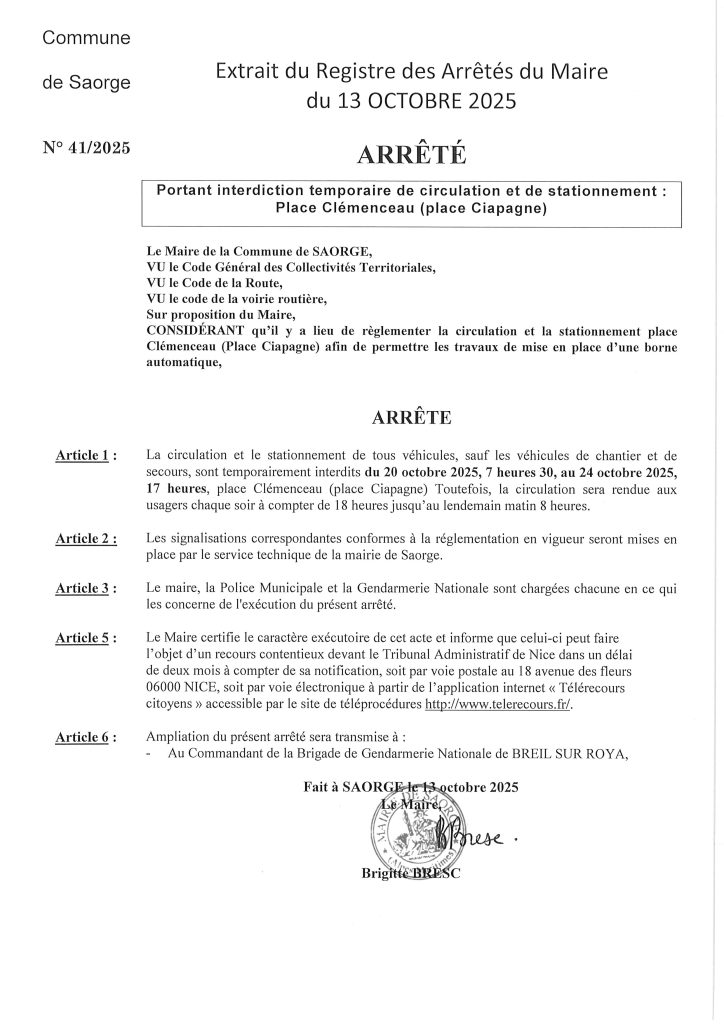 Interdiction temporaire de circulation et de stationnement Place Clémenceau (Ciapagne) du 20 au 24 octobrepar adm-saorgesur Publié le 13/10/2025