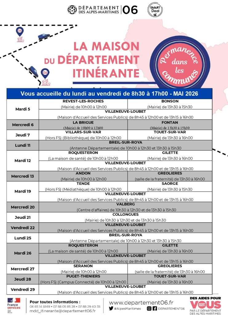 Permanence de la Maison du Département Itinérante en mai 2026par adm-saorgesur Publié le 22/04/202622/04/2026