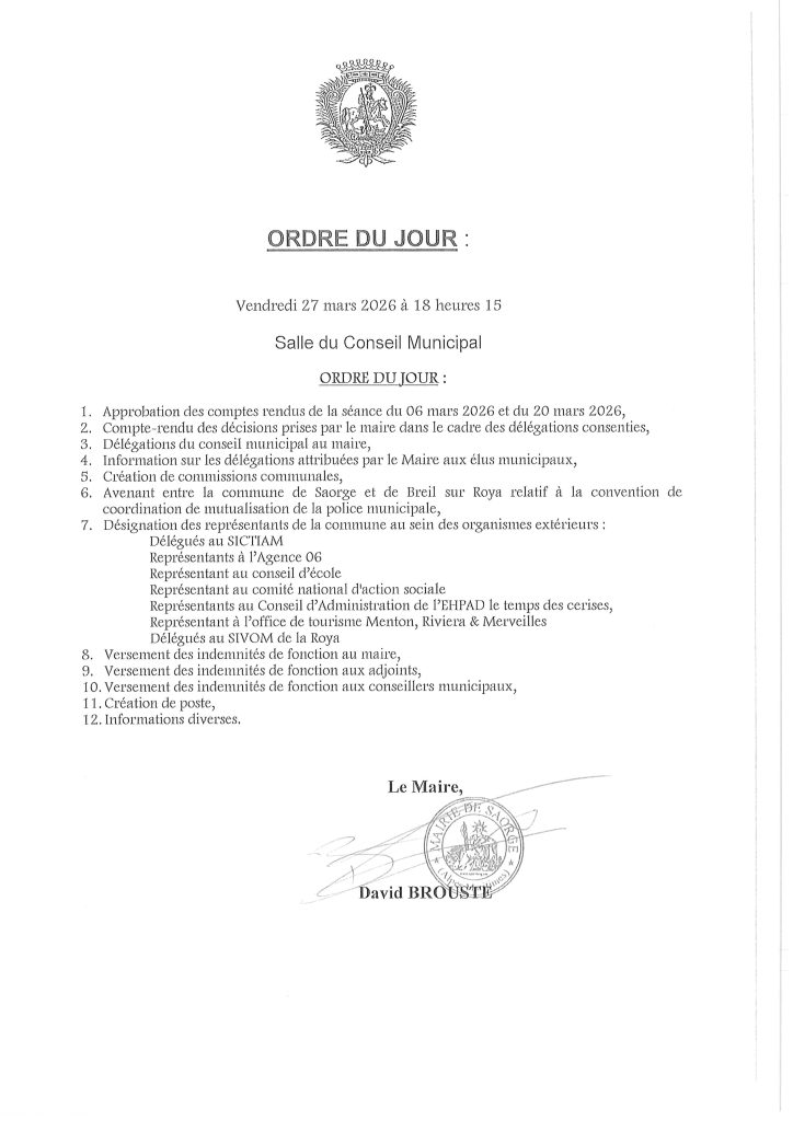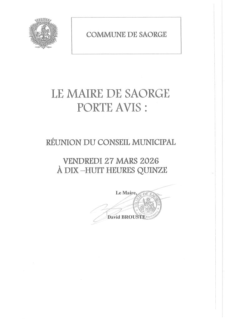 Réunion du Conseil Municipal vendredi 27 mars 2026 à 18h15par adm-saorgesur Publié le 23/03/202623/03/2026